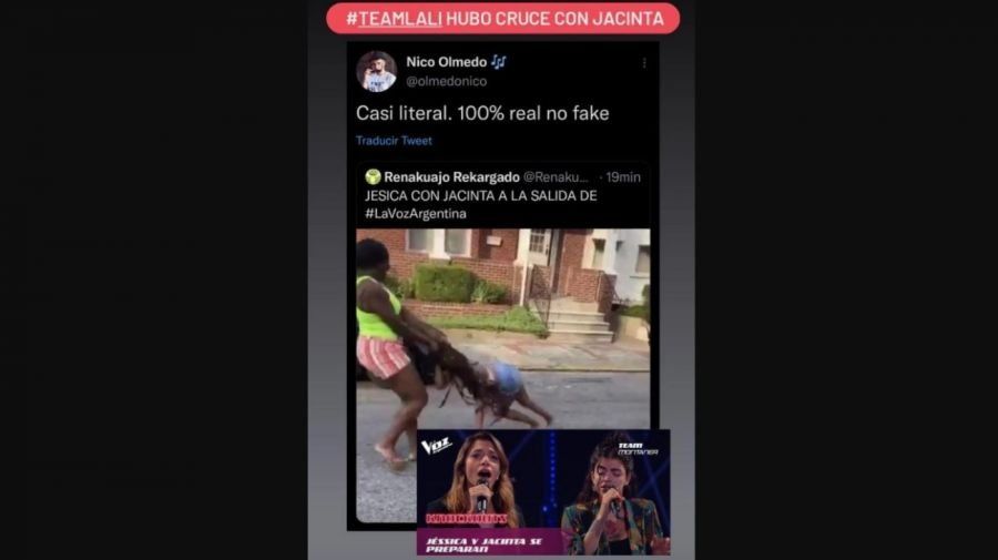 Nicolás Olmedo, integrante del Team Lali Espósito, aprovecho el comentario de un usuario de Twitter que puso "Jesica con Jacinta a la salida de La Voz Argentina" junto a una imagen que mostraba a una mujer agarrando de los pelos a la otra para graficar la tensión del momento después de que Ricardo Montaner se decidió por Jacinta, dejando afuera del reality musical de Telefe a Jéssica.