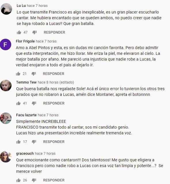 “De verdad, espectacular. Lucas, siento que lo hiciste espectacular, pero una cosa te jugó en contra y es estar al lado de él (por Francisco) y estar al lado de él es jodido para cualquiera porque tiene una cosa que es imposible no conmoverse al escucharlo”, fue la devolución de Ricky Montaner. “Me da hasta vergüenza estar sentado aquí. Respeto a ambos. Pero qué belleza de momento”, agregó el reggaetonero.