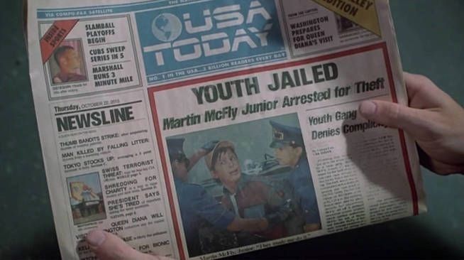 En una de las escenas de Volver al futuro II (estrenada en 1989), vemos al protagonista viajar hasta el año 2015 y observar un ejemplar del USA Today de ese día. En la portada, la noticia principal se hace eco de su propia detención, pero entre los otros titulares que completan la primera página del ejemplar, aparece este: “La reina Diana visitará Washington”.