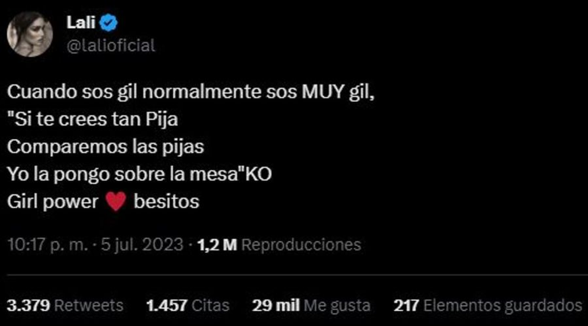 "Cuando sos gil normalmente sos MUY gil", escribió Lali sin mencionar a nadie. Acto seguido, en el mismo tuit, agregó parte de la letra de su tema KO que dice: "Si te crees tan Pija, comparemos las pijas. Yo la pongo sobre la mesa". Luego, finalizó con un "KO (en referencia a su canción). Girl power, besitos".
