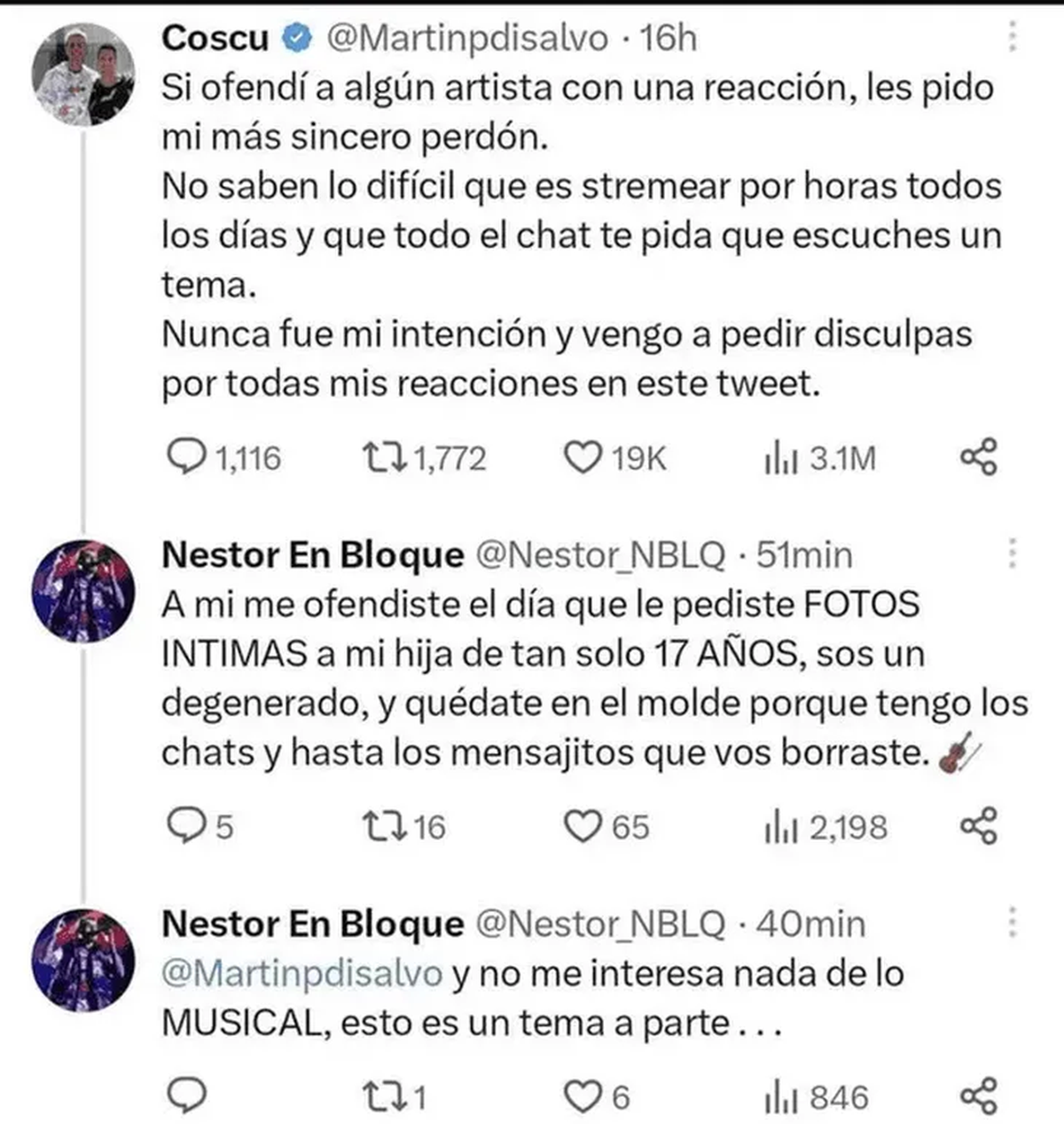 "A mí me ofendiste el día que le pediste fotos íntimas a mi hija de tan solo 17 años, sos un degenerado. Y quedáte en el molde porque tengo los chats y hasta los mensajitos que vos borraste. Y no me interesa nada de lo musical, esto es un tema aparte", aseguró Néstor.