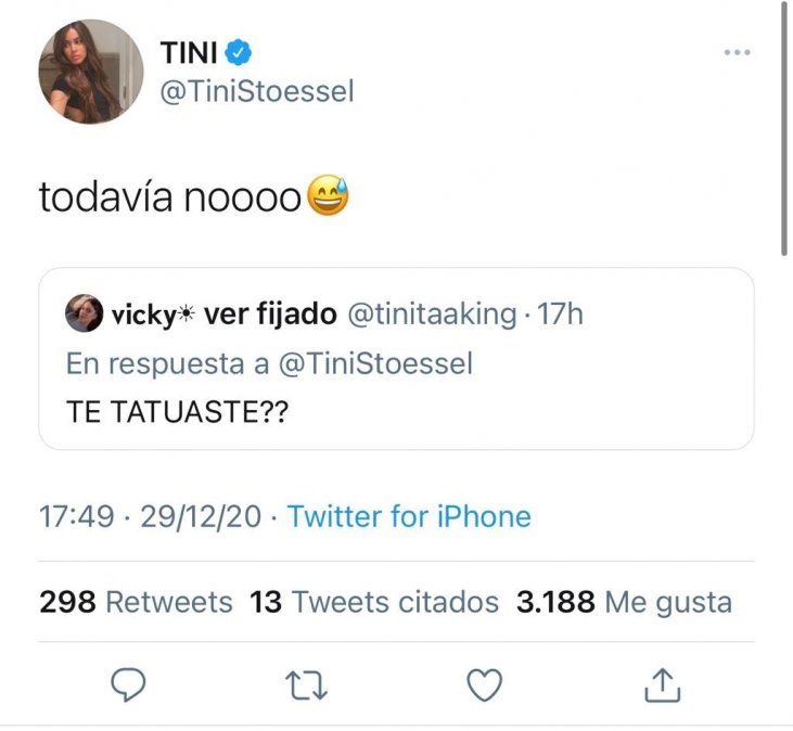 Días antes, las cantantes llamaron la atención de sus seguidores con un anuncio en Twitter. Una fan publicó un tweet diciendo "Tini y Camila vuelven de Miami con un tatuaje, guarden este tw"; lo que no esperaba la seguidora es que la misma Tini cite el mensaje con una extensa risa. A lo que la chilena le contestó afirmando que sentía que tenían cámaras que las vigilan, dejando entrever que planearon un tatuaje juntas.