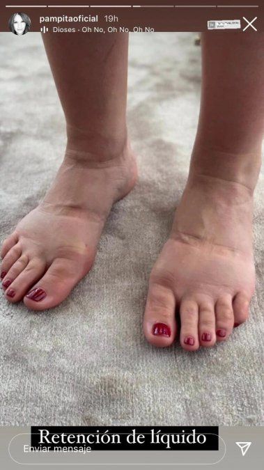 En la primera acompañó la imagen con la descripción: "Retención de líquido..". Con la segunda, le adjuntó una empanada hecha emoticon. En ambas se puede observar los pies hinchados de la modelo y conductora, mientras cursa su último mes de embarazo. Un verdadero gesto de solidaridad de parte de la top argentina.