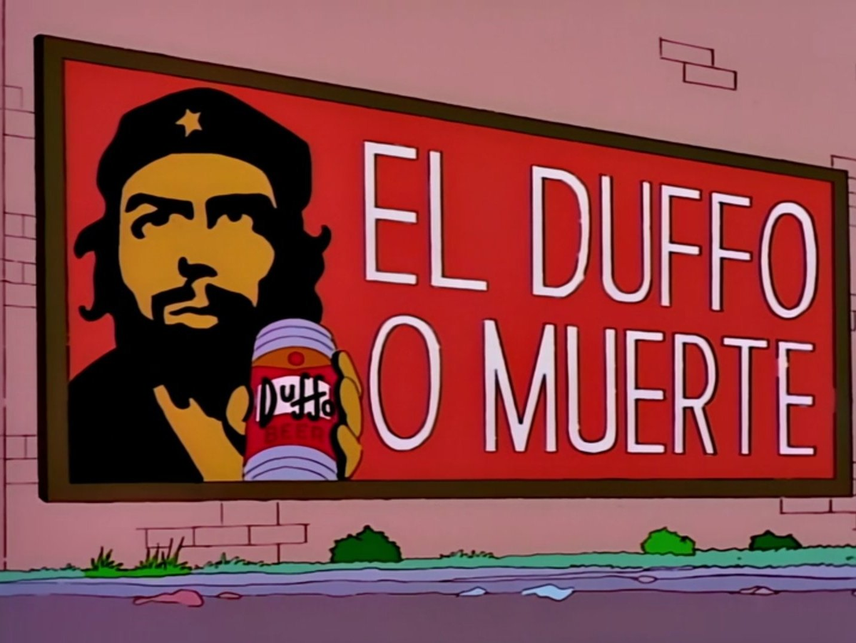 Homero, Smithers y Burns escapan a Cuba. Allí, mientras viajan en taxi, se muestra una publicidad de una cerveza llamada "El Duffo", cuyo slogan es "El Duffo o Muerte" y se ve al "Che" con una lata. El lema es una referencia a "Patria o Muerte".