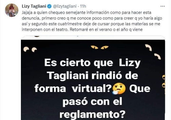 Lejos de quedarse callada, la humorista respondió citando el mensaje original: “Jajaja quién chequeó semejante información como para hacer esta denuncia. Primero, creo que me conoce poco como para creer que yo haría algo así y segundo, este cuatrimestre dejé de cursar porque las materias se me interponen con el teatro. Retomaré en el verano o el año que viene”, reveló Lizy.