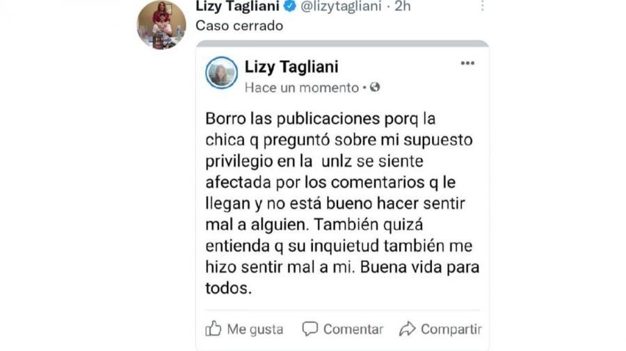 Luego de unas horas, la figura de Telefe, decidió borrar la publicación tras el pedido de la estudiante por la lluvia de comentarios que llegaban en defensa de Lizy.