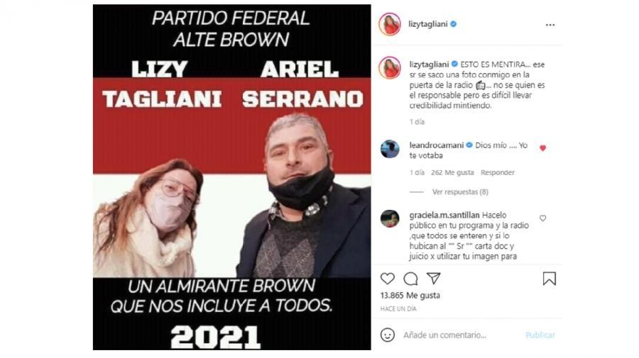La imagen en cuestión es del estilo "afiche" que tiene a la actriz y presentadora de televisión junto con un sujeto llamado Ariel Serrano. "Partido Federal. Lizy Tagliani, Ariel Serrano. Un Almirante Brown que nos incluye a todos. 2021", se agrega en la foto de colores negro, rojo y blanco.