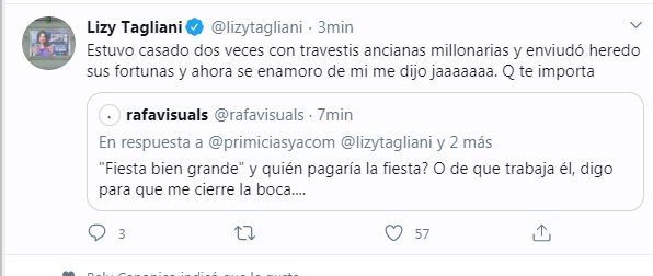 Un usuario de Twitter levantó las declaraciones de Leo e hizo un ácido comentario: ""Fiesta bien grande" ¿Y quién pagaría la fiesta? ¿O de qué trabaja él? Digo para que me cierre la boca...". Lizy, rápidamente, lo dejó mudo con su divertida respuestas: "Estuvo casado dos veces con travestis ancianas millonarias y enviudó, heredo sus fortunas y ahora se enamoro de mi me dijo. Jaaaa ¡¿Qué te importa?!".