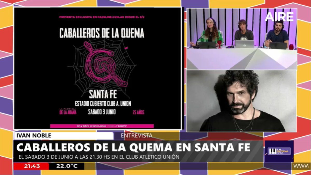“Pensé que las bodas de plata eran de esas cosas que sólo le pasaban a los matrimonios… a los que llegan”, sostuvo Iván Noble, líder de Los Caballeros de la Quema, banda que se presentará en Santa Fe en el marco de la gira que conmemora los 25 años de la edición del disco “La Paciencia de la Araña”. El músico brindó una entrevista en La Octava Nota, por AIRE, con Andrea Viñuela, Ailén Fortuna, Nachi Hernandez y Martín Cartellone.
