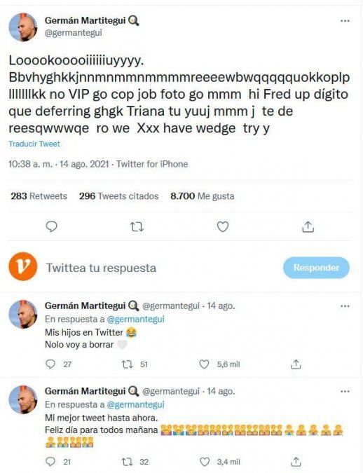 A los minutos, Martitegui se dio cuenta de la travesura pero en lugar de borrar el mensaje, se enterneció por completo. “Mis hijos en Twitter. No lo voy a borrar”, escribió.