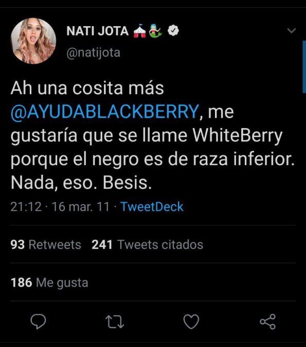 La polémica no terminó allí. En las últimas horas, los usuarios de Twitter sacaron a la luz varios escritos de la periodista Nati Jota, quien rápidamente fue repudiada por sus dichos racistas y discriminatorios.