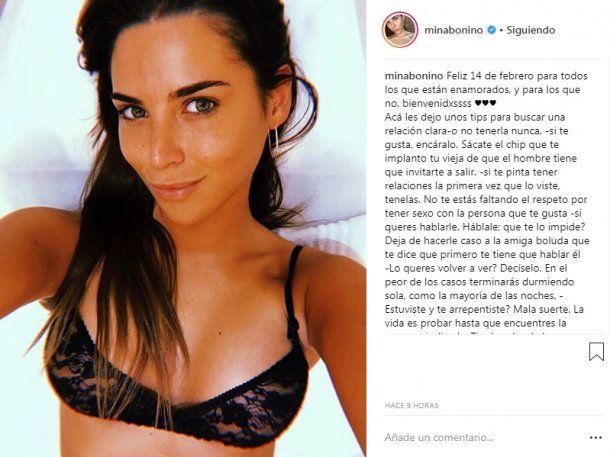 “Feliz 14 de febrero para todos los que están enamorados, y para los que no, bienvenidxssss. Acá les dejo unos tips para buscar una relación clara- o no tenerla nunca”, comentó previo a la lista que publicó con una foto muy sexy y llamativa en su perfil de Instagram.