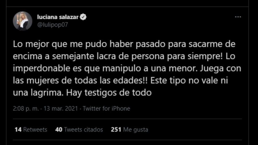 Luciana Salazar rompió la calma del sábado con fuertes mensajes en Twitter, inicialmente, sin nombrar al economista con el que ya tuvo tantas vueltas que es imposible numerar. “¡Lo mejor que me pudo haber pasado para sacarme de encima a semejante lacra de persona para siempre!”, comenzó la furia de Luli Salazar.