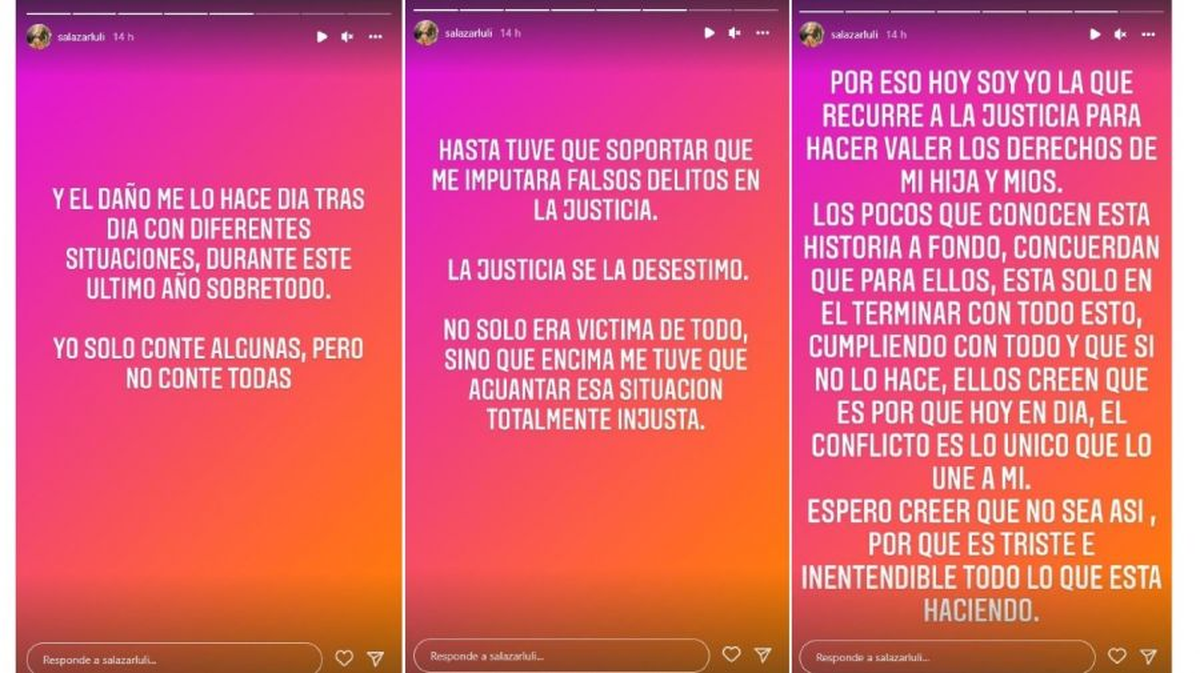 Luciana Salazar lo acusó también de haberle imputado falsos delitos en la justicia, que fueron desestimados y “por eso hoy soy yo la que recurre a la justicia para hacer valer los derechos de mi hija y mio.Los pocos que conocen esta historia a fondo... Es triste e inentendible todo lo que está haciendo”, finalizó.