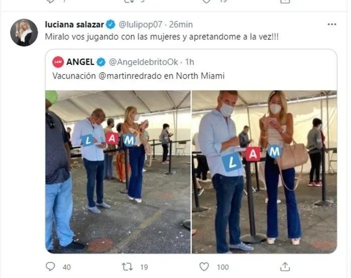 Luciana Salazar estalló de furia en Twitter al ver fotos de Martín Redrado con otra mujer en Miami. Lo que parecía una reconciliación en Estados Unidos y un cambio por parte de ambos terminó en un verdadero escándalo que hoy se hizo público en Twitter.