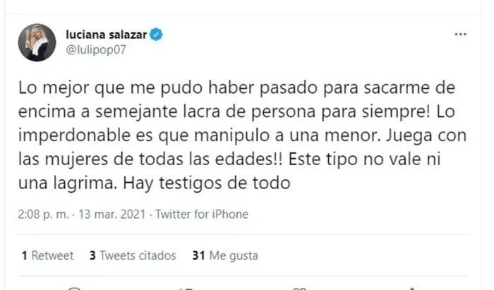 Y luego agregó: "Lo mejor que me pudo haber pasado para sacarme de encima a semejante lacra de persona para siempre!".
