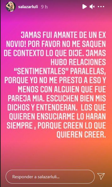“¡Jamás fui amante de un ex novio! Por favor no saquen de contexto lo que dije. Jamás hubo relaciones 'sentimentales' paralelas porque yo no me presto a eso y menos con alguien que fue pareja mía. Escuchen bien mis dichos y entenderán. Los que quieren ensuciarme lo harán siempre porque creen lo que quieren creer", escribió en una storie de Instagram Luciana.