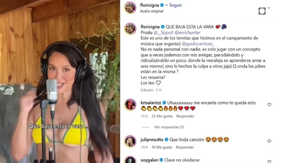 “Este es uno de los temitas que hicimos en el campamento de música que organizó Guido Cardozo”, explicó Vigna en su publicación. Luego, intentó despegarse de cualquier interpretación personal: “No es nada personal con nadie, es solo jugar con un concepto que, a veces, jodemos con mis amigas, parodiándolo y ridiculizándolo un poco. La moraleja es aprender a amarse a uno mismo”.