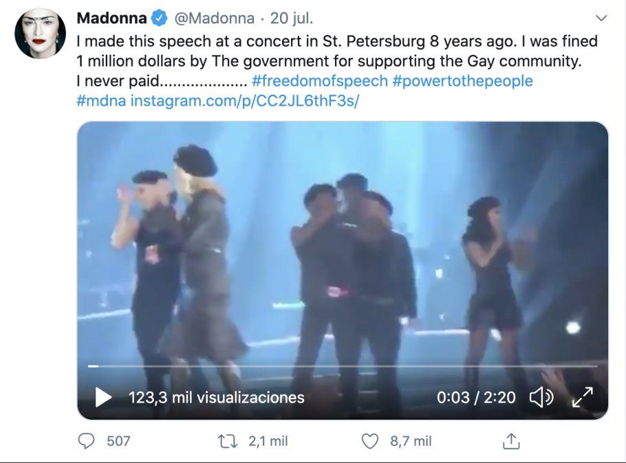 Madonna es una de las artistas más aclamadas mundialmente y además de por su gran talento y trayectoria, es conocida por ser irreverente y expresarse sin tapujos. La intérprete de “Vogue” se ha presentado en importantes escenarios en diversos países; en uno de sus conciertos en San Petersburgo, Rusia, realizado hace 8 años, la diva emitió un discurso en apoyo a la comunidad LGBTTI y fue multada por el gobierno ruso por “hacer propaganda a la homosexualidad”.