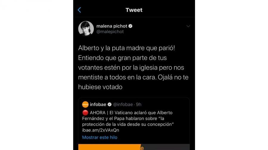 Tras la difusión de ese comunicado, Pichot, quien es una reconocida militante del feminismo y de la Campaña Nacional por el Aborto Legal, Seguro y Gratuito, fue la protagonista de una captura controversial que se viralizó en la red social del pajarito. “Alberto y la puta madre que parió (sic). Entiendo que gran parte de tus votantes estén por la Iglesia, pero nos mentiste a todos en la cara. Ojalá no te hubiese votado”, fue el mensaje que le adjudicaron a la conductora de Futurock, a quien también la acusaron de haberlo borrado por las posibles críticas que sus palabras podían traerle.
