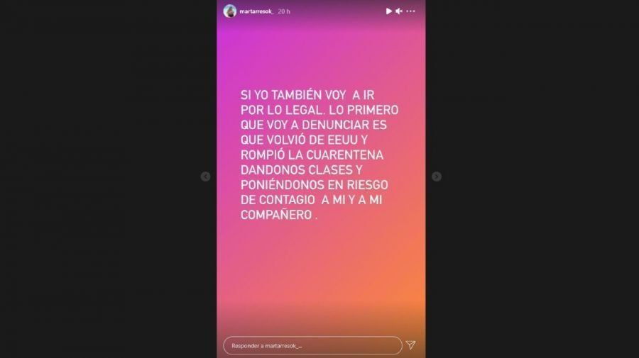 En otra historia, la influencer y empresaria de "moda plus size" respondió al anuncio de Kovalovsky, quien la llevará a la Justicia por calumnias, con una advertencia similar: "Sí, yo también voy a ir por lo legal. Lo primero que voy a denunciar es que volvió de Estados Unidos y rompió la cuarentena dándonos clases y poniéndonos en riesgo de contagio a mí y a mi compañero", señaló sobre los ensayos que habrían sucedido -según dijo la misma Mar- en abril.