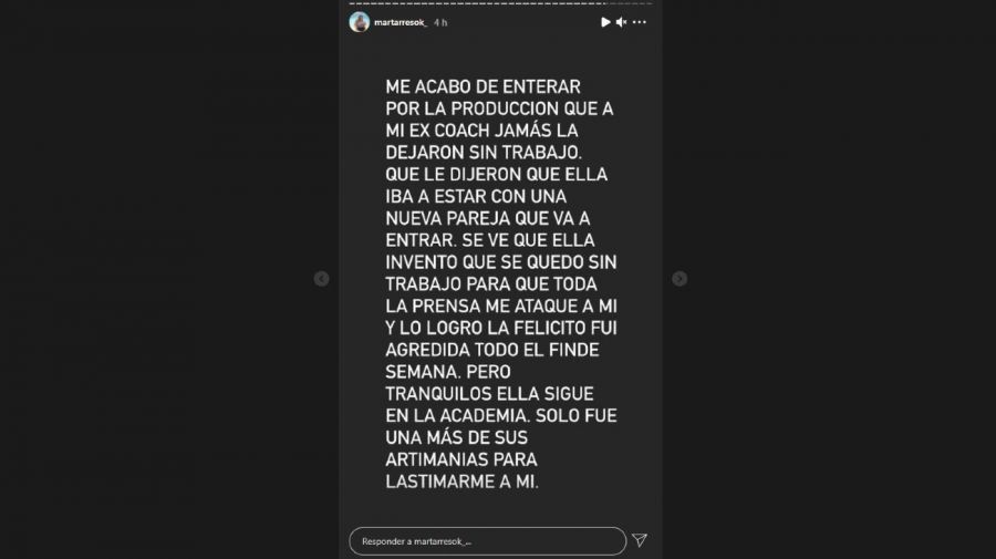 "Me acabo de enterar por la producción que mi ex coach jamás la dejaron sin trabajo. Que le dijeron que ella iba a estar con una nueva pareja que va a entrar", empezó Mar una de sus historias de Instagram, negando los dichos de Judith y de De Brito, aunque a él no lo mencionó.