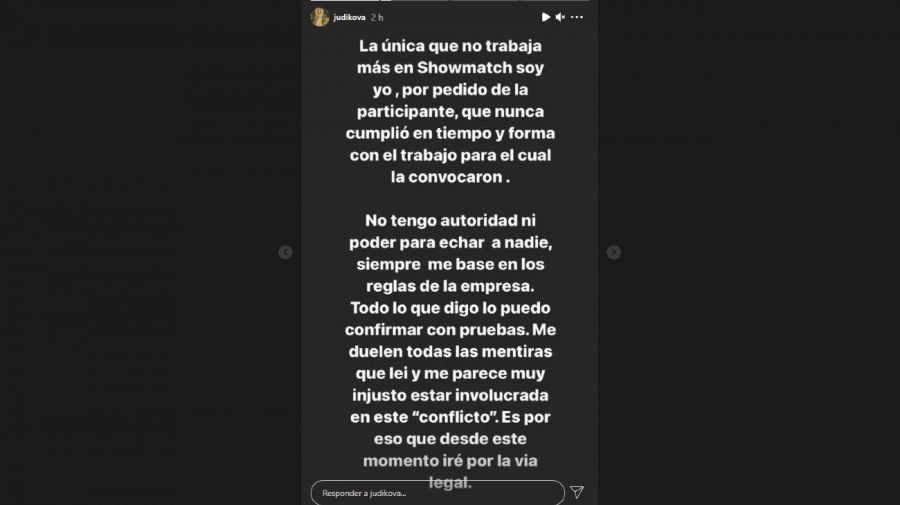 Por último, expresó que "Me duelen todas las mentiras que leí y me parece injusto estar involucrada en este 'conflicto'", y contó que "Desde este momento iré por la vía legal", concluyó Judith Kovalovsky su descargo contra Mar Tarrés, quien la tildó de traidora y la acusó de dejar sin trabajo a otros.
