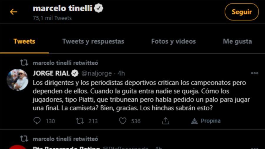 En la red social del pajarito, el conductor de Showmatch (El Trece) le dio retuit a un fuerte mensaje escrito por Jorge Rial, en el que se hacia mención de los dichos de Piatti que convulsionaron no solo a la actualidad del conjunto de Boedo, sino también a todo el fútbol argentino.
