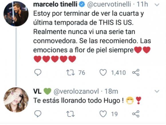 "Estoy por terminar de ver la cuarta y última temporada de This is us. Realmente nunca vi una serie tan conmovedora. Se las recomiendo. Las emociones a flor de piel, siempre", expresó en conductor en Twitter.