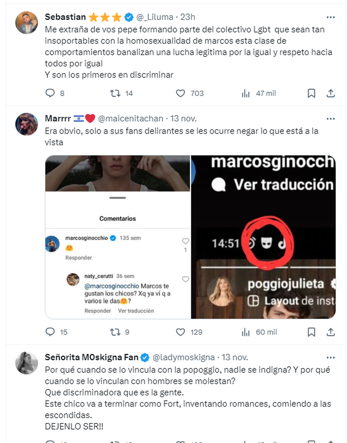 Todo se desencadenó cuando uno de sus seguidores le compartió una foto donde aparecía con Julieta Poggio: “Que soporten las virgas. Ah y Marcos es gay”. La exdiputada le puso "corazoncito" y se hundió, ya que la captura se viralizó rápidamente.