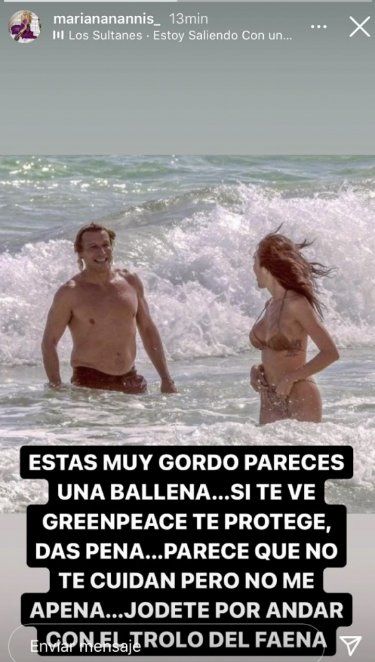 “Parece que no te cuidan, pero no me apena, Jodete por andar con el trolo del Faena" en referencia al hotel donde Caniggia estuvo instalado largo tiempo, sumó, sobre una imagen que se ve al deportista y su novia disfrutando en el mar, que acompañó con la canción de Los sultanes.