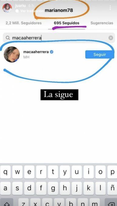 En primer lugar, la panelista de Bendita (El Nueve) buscó entre los "seguidos" del actor -y ahora también cantante- para visibilizar que sigue a Maca. Junto a la captura de pantalla, Juariu afirmó "la sigue".