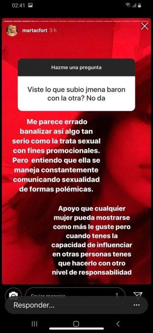 “Viste lo que subió Jimena Barón con la otra? no da”, le preguntó un seguidores. Martita no dudó en responder: “Me parece errado banalizar así algo tan serio como la trata sexual con fines promocionales. Pero entiendo que ella se maneja constantemente comunicando sexualidad de formas polémicas”.