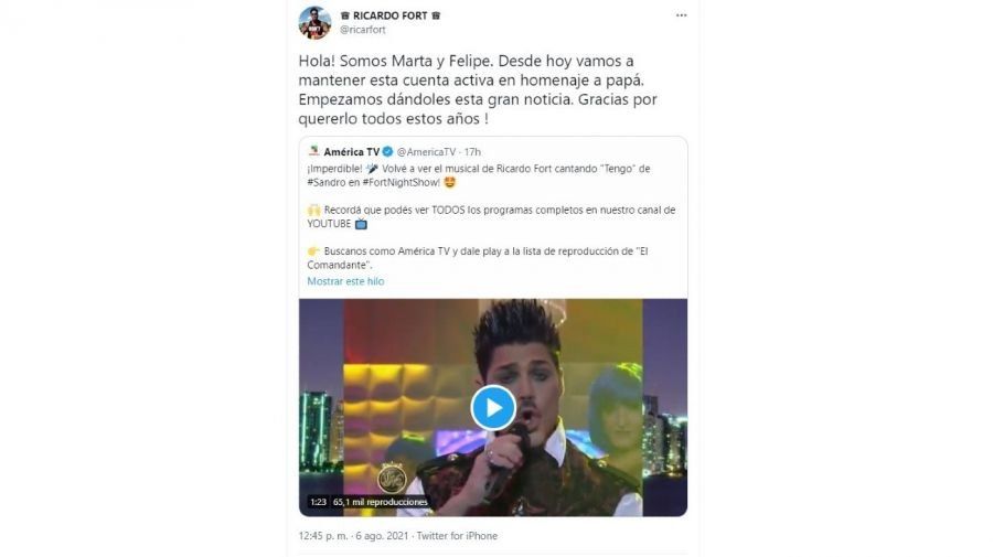 Marta y Felipe Fort quieren que todos recuerden a su padre, Ricardo, por eso, además de estar detrás de la serie que trata su vida, en las últimas horas sorprendieron al publicar un mensaje desde las redes sociales de El Comandante, anunciaron que se harán cargo de su cuenta y que América TV trasmitirá nuevamente contenido de Fort Night Show, el programa que condujo el empresario durante cuatro meses en esa pantalla.