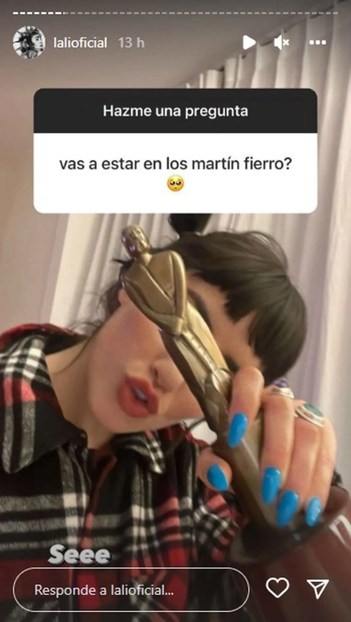 A través de su cuenta en Instagram, Lali confirmó su presencia el domingo. En las historias, la intérprete de Disciplina respondió a una pregunta de una usuaria que le consultaba si asistiría a la ceremonia y ella le contestó con una estatuilla de Martín Fierro en la mano y con un contundente "Seee".