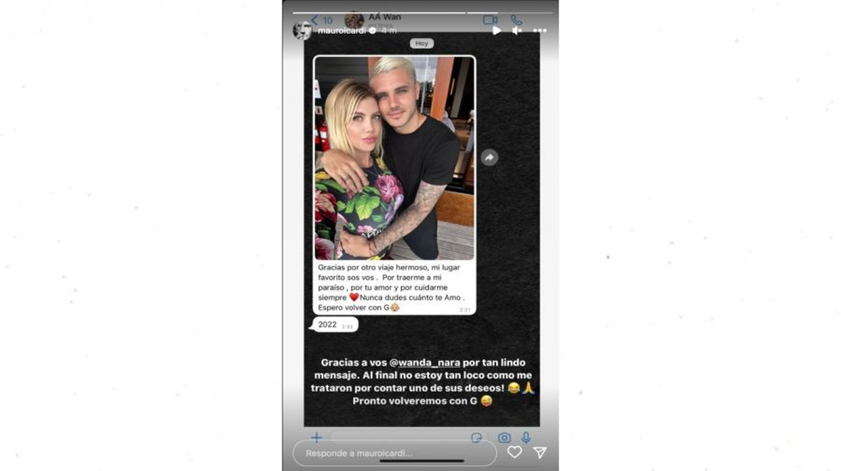 El futbolista del Galatasaray publicó una captura de su chat con Wanda, en el cual se leía que se trataba de un mensaje que le envió hoy como forma de agradecimiento por sus días en las Maldivas: "Gracias por otro viaje hermoso, mi lugar favorito sos vos. Por traerme a mi paraíso, por tu amor y por cuidarme siempre. Nunca dudes cuánto te amo. Espero volver con G. 2022". Por su parte, Mauro acompañó la imagen con este texto: "Gracias a vos @wanda_nara por tan lindo mensaje. Al final no estoy tan loco como me trataron por contar uno de sus deseos. Pronto volveremos con G".