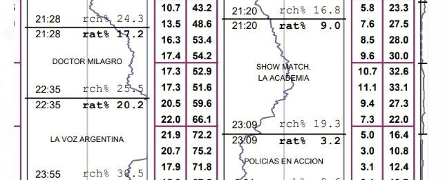 De acuerdo a las mediciones que brindó IBOPE, "ShowMatch La Academia" alcanzó ayer un bajo promedio de 9 puntos de rating en la pantalla de El Trece. "Doctor Milagro", por su parte, sigue imparable y casi lo duplicó con un altísimo promedio de 17.2 puntos de rating en la pantalla de Telefe. Como era de esperarse, el «Cabezón» también sufrió más de la cuenta con "La Voz Argentina". Es que el reality de canto conducido por Marley logró un promedio de 20.2 puntos de rating y fue una vez más lo más visto de la tv argentina.