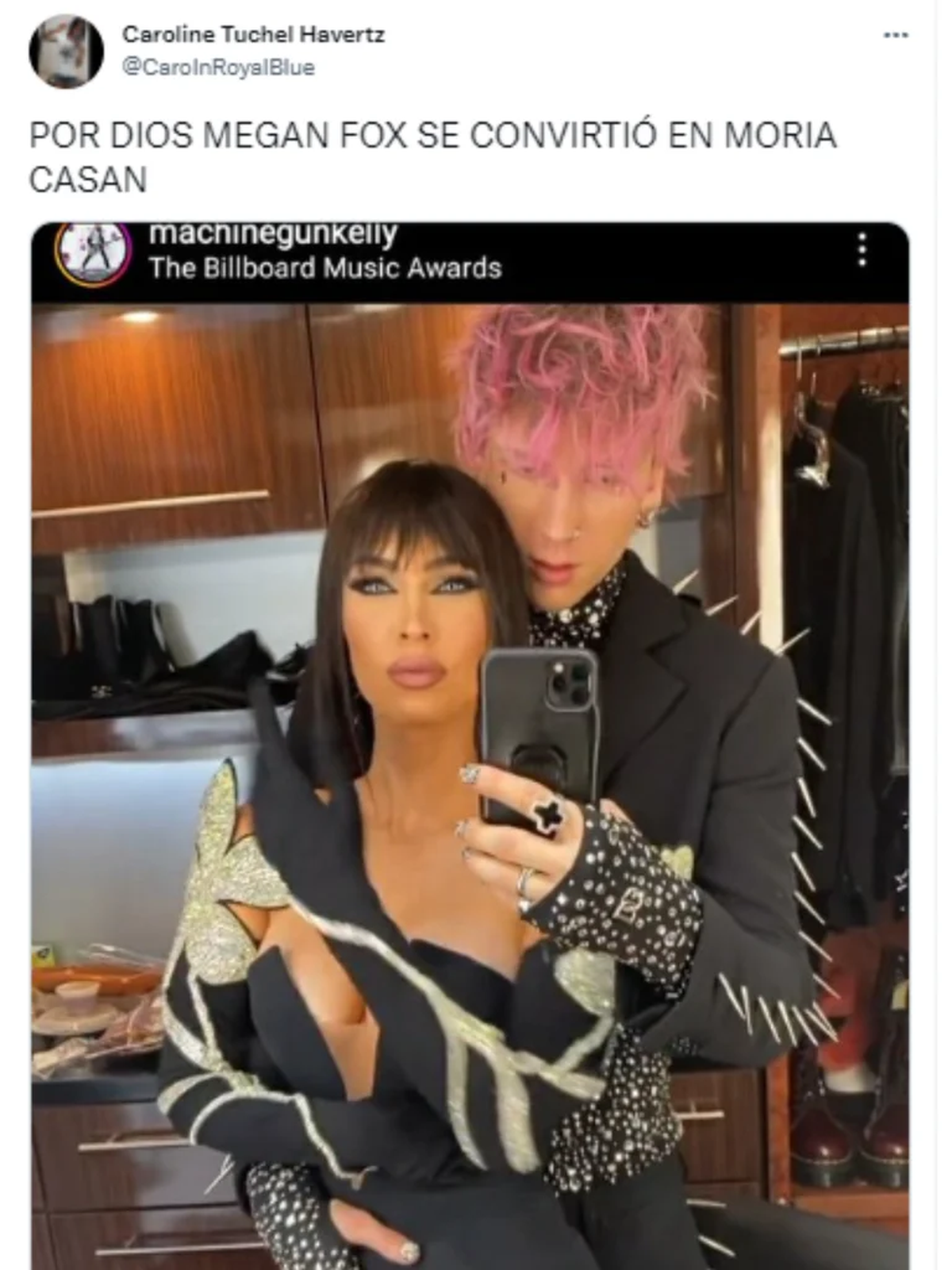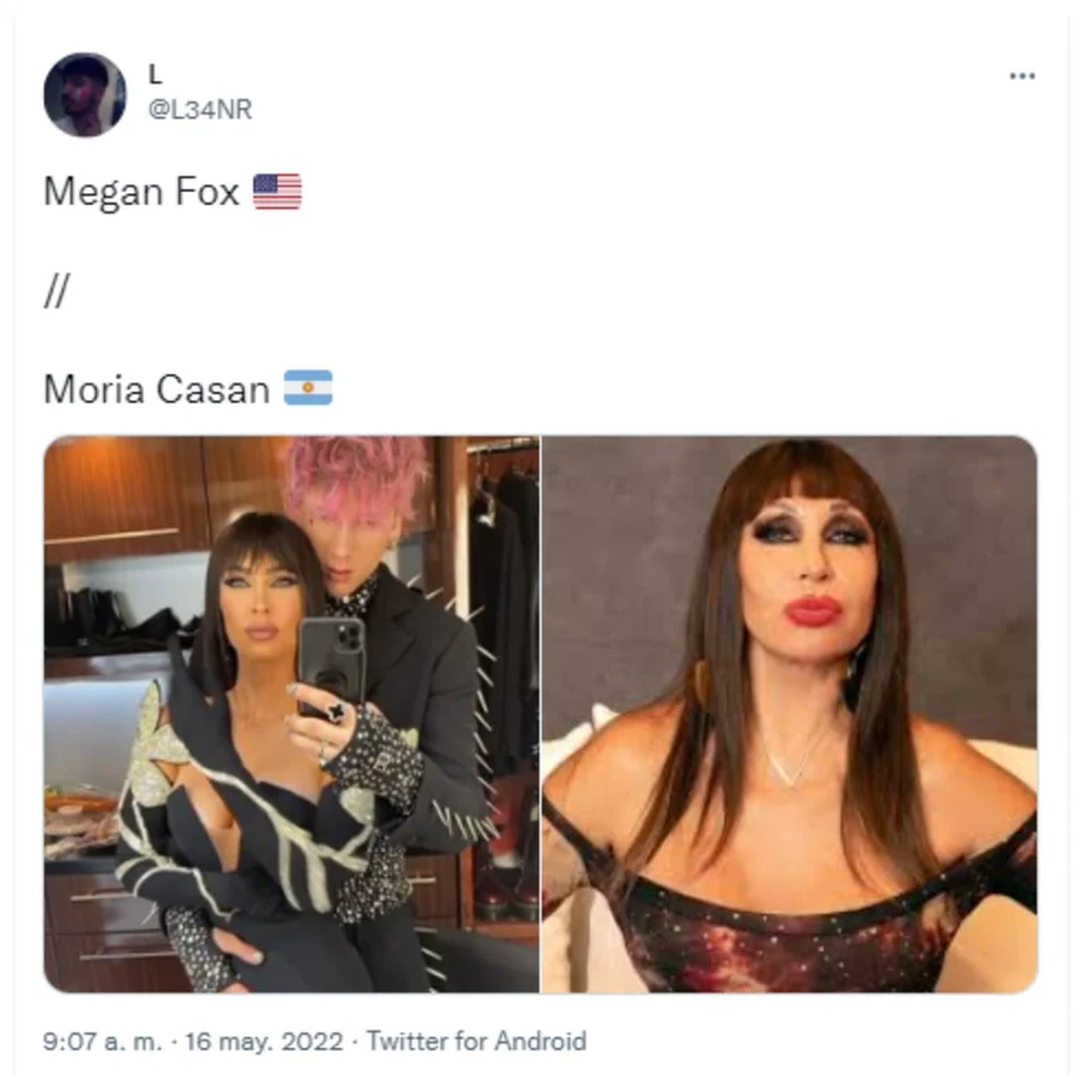 Como todo cambio de imagen, hubo muchos comentarios tanto a favor como en contra en las redes sociales. Sin embargo, lo más desopilante se vio cuando la compararon nada más ni nada menos que con Moria Casán. “Por dios, Megan Fox se convirtió en Moria Casán”, escribió un usuario en Twitter. “Son Moria Casan y el Polaco”, sumó otro, a modo de broma. Y otro apuntó: “Megan Fox se copió la cara de Moria Casán y Zac Efron la de Ricardo Fort. Increíble la influencia de la farándula argentina”. Lo cierto es que las imágenes que compartió el músico con su novia superaron los 700 mil likes en Instagram.