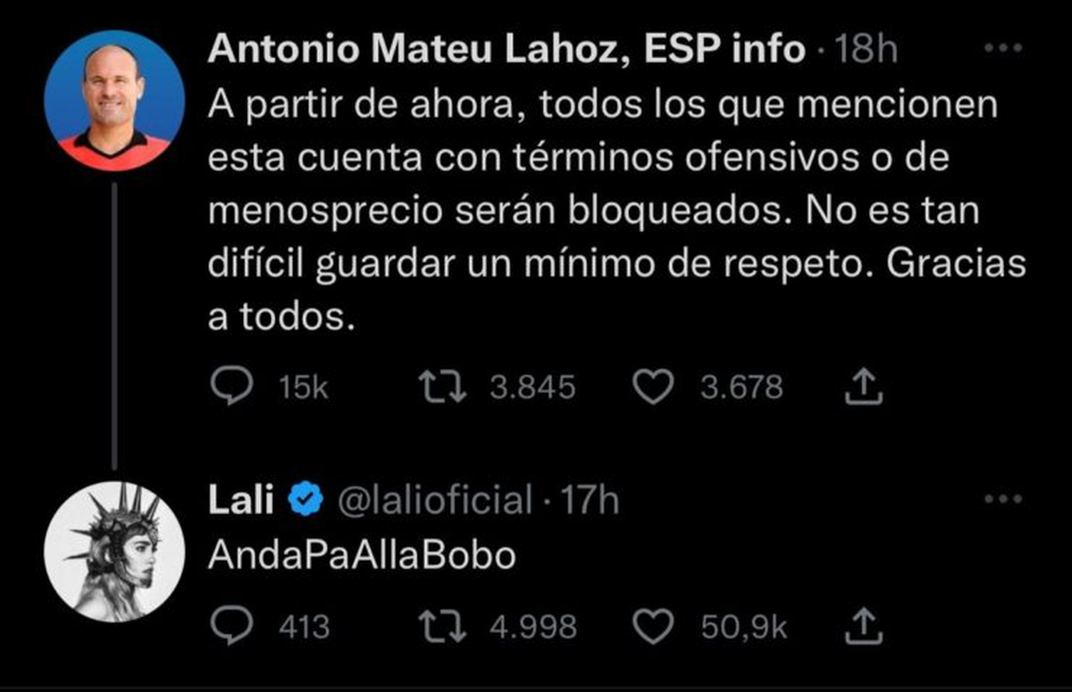 A través de su cuenta de Twitter, Mateu Lahoz dijo: "A partir de ahora, todos los que mencionen esta cuenta con términos ofensivos o de menosprecio serán bloqueados. No es tan difícil guardar un mínimo de respeto. Gracias a todos".