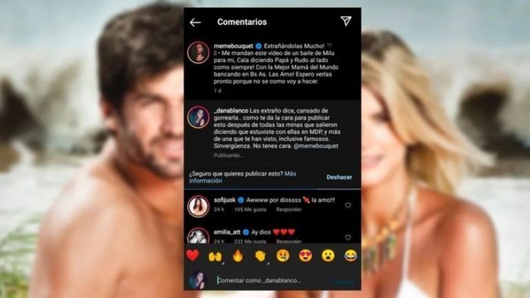 Una usuaria interpeló al marido de la actriz con un fuerte escrache. "Las extraño dice.... se cansó de gorrearla. ¿Cómo te da la cara para publicar esto después de todas las mujeres que dijeron que estuviste con ellas en Mar del Plata?". Minutos después, Meme Bouquet borró el mensaje y cerró los comentarios en su perfil en Instagram.