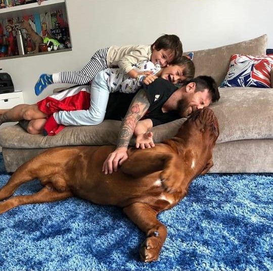 Por esa razón cada imagen que sube genera furor. En esta ocasión, el crack se animó a hacer una escalera humana con sus dos hijos mayores: Thiago y Mateo. El detalle más divertido: su perro “Hulk”, un dogo de Burdeos gigante.