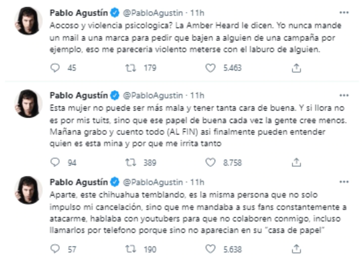Pablo Agustín recogió el guante y arremetió contra ella por la misma red social. A pura ironía expresó: “¿Acoso y violencia psicologica? La Amber Heard le dicen”.