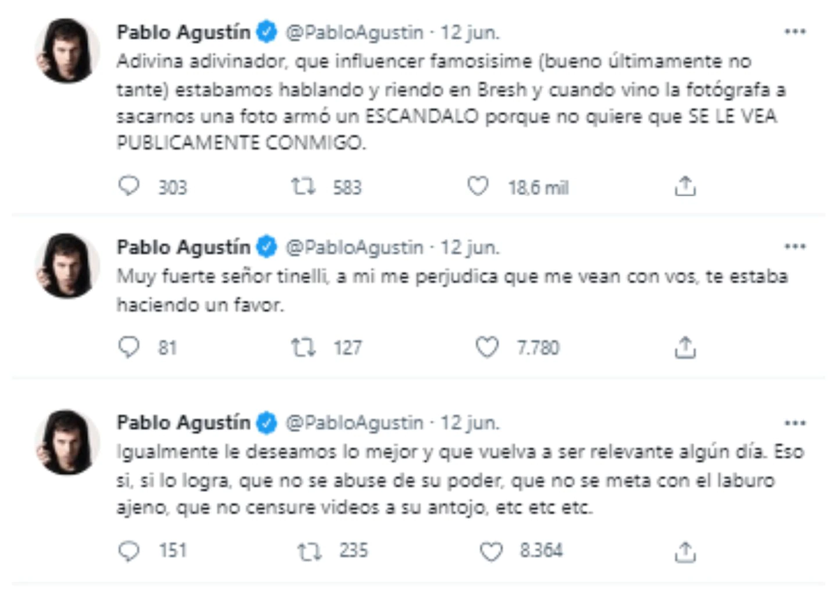 En las últimas horas Pablo Agustín y Mica Suárez fueron tendencia después de protagonizar un tenso cruce en redes sociales. El creador de contenido apuntó contra la influencer por sabotearle trabajos, y ella lo acusó de hostigamiento y violencia psicológica. Todo comenzó cuando Pablo Agustín se despachó en Twitter con un enigmático. “Adivina adivinador, que influencer famosísime (bueno, últimamente no tanto) estábamos hablando y riendo en Bresh y cuando vino la fotógrafa a sacarnos una foto armó un escándalo porque no quiere que se la vea públicamente conmigo”, escribió.
