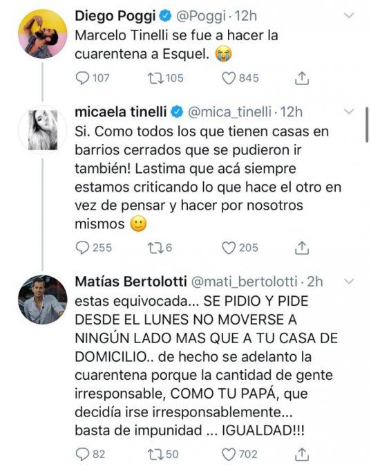 Pasadas las horas, quien tuvo un tenso cruce twittero con dos periodistas de TN, fue Mica Tinelli, que intentó defender la decisión familiar. El conductor, Diego Poggi, publicó un picante tweet. "Marcelo Tinellli se fue hacer la cuarentena a Esquel" y lo acompañó de un emoji que llora.