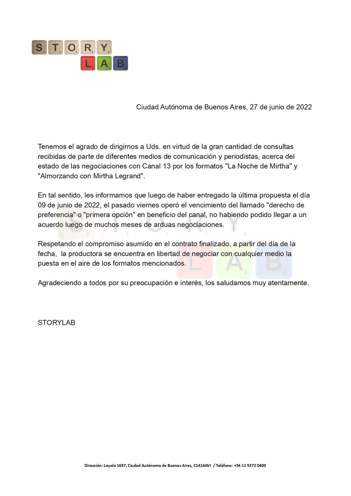 "Respetando el compromiso asumido en el contrato finalizado, a partir del día de la fecha, la productora se encuentra en libertad de negociar con cualquier medio la puesta en el aire de los formatos mencionados", se explayó Story Lab en su comunicación.