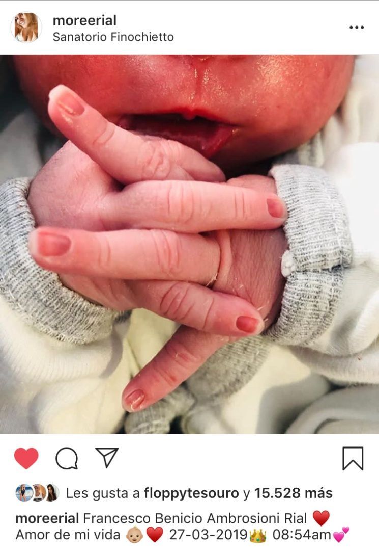 “Bienvenido hijo, una felicidad inexplicable. Te amo”, escribió Facundo en Instagram para presentar las manitos de su hijito. Una foto muy parecida usó la flamante mamá, que lo describió como “amor de mi vida”.