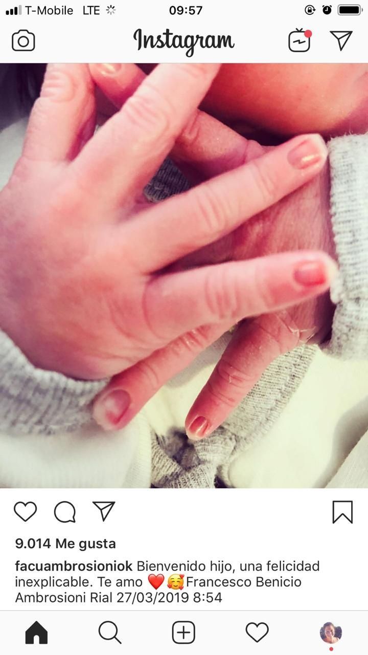 “Bienvenido hijo, una felicidad inexplicable. Te amo”, escribió Facundo en Instagram para presentar las manitos de su hijito. Una foto muy parecida usó la flamante mamá, que lo describió como “amor de mi vida”.