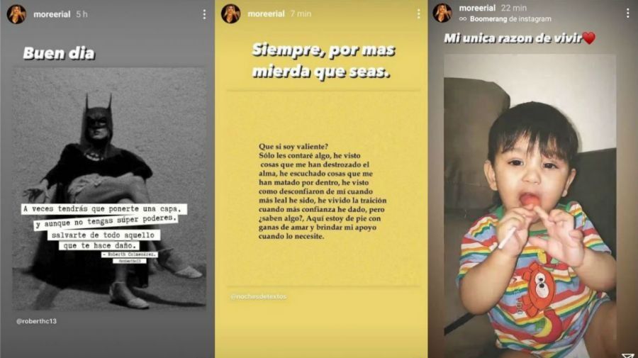 En otra Instagram Stories, agregó "Siempre, por más mierda que seas", un comentario que acompañó con una nueva frase: "¿Que si soy valiente? Sólo les contaré algo, he visto cosas que me han destrozado el alma, he escuchado cosas que me han matado por dentro, he visto cómo desconfiaron de mí cuando más leal he sido, he vivido la traición cuando más confianza he dado, pero ¿saben algo?, aquí estoy de pie con ganas de amar y brindar mi apoyo cuando lo necesite".