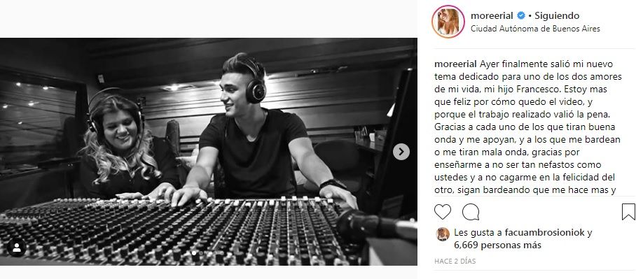 En su cuenta de Instagram, Morena escribió: “Finalmente salió mi nuevo tema dedicado para uno de los dos amores de mi vida, mi hijo Francesco. Estoy más que feliz por cómo quedo el video, y porque el trabajo realizado valió la pena”.