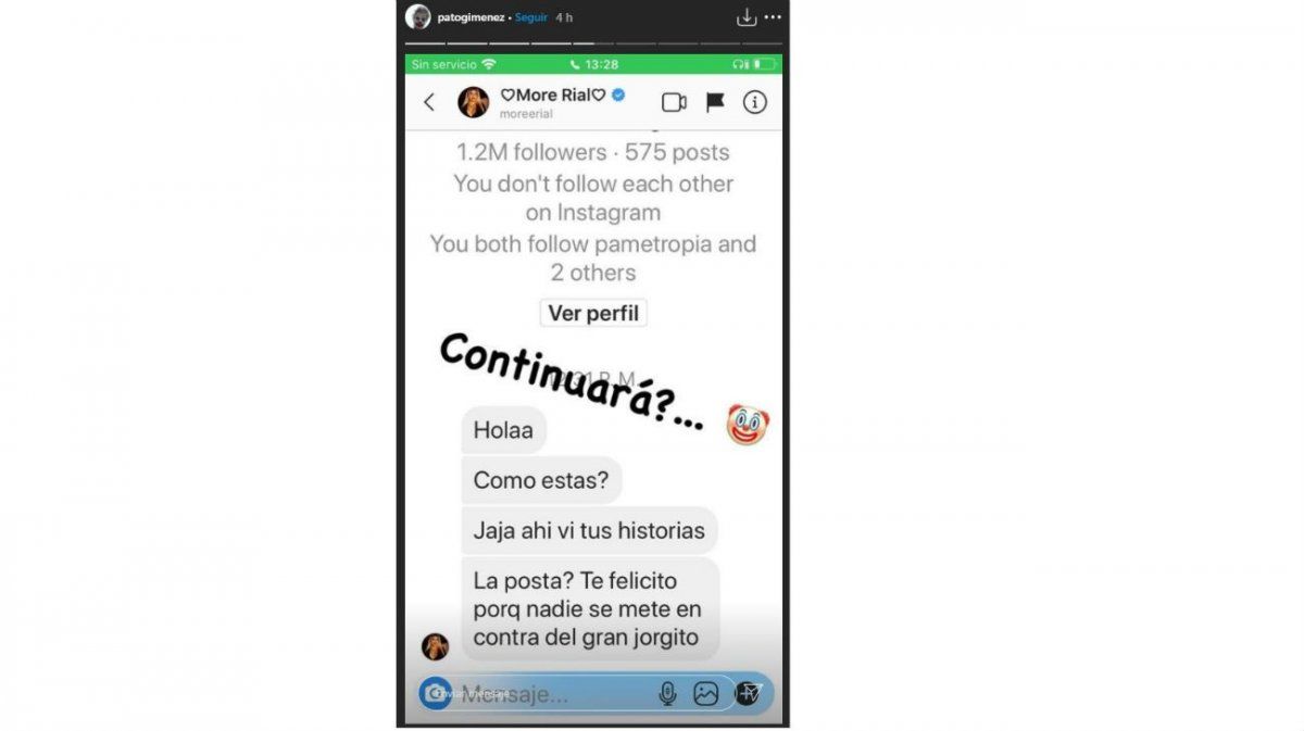 En la imagen que publicó tras esa grabación, se ve un mensaje que Morena le envió a él, donde lo banca por haber enfrentado a su padre. "Holaa, ¿cómo estás? Jaja ahí vi tus historias. ¿La posta? Te felicito porque nadie se mete en contra del gran Jorgito", reza el mensaje que la hija de Jorge Rial le mandó a Patricio Giménez a través de Instagram, según informa Exitoina.